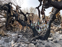Each time I came to the forest to hang my mobiles and bring it joy, I left feeling strengthened. From the cracked, scorched earth, tender raspberry and mallow leaves rise. Inside the hollow spaces left by the charred pine trunks, seeds of cypress and pine are gathering, waiting for rain. Green prickly pear pads gleam between the blackened ones. The forest is alive and pulsing beneath the ash.
